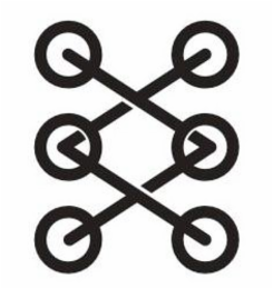 The mark consists of six circles connected by diagonal lines, forming a symmetric, lattice-like structure. All the lines pointing towards the center of the design, where the diagonal lines intersect..