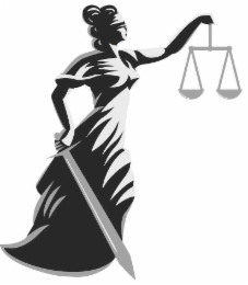 The mark consists of the design of a goddess wearing a blindfold and a long dress. The goddess is holding a sword in one hand and holding up a scales of justice in the other hand.
