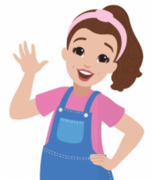 The mark consists of the upper body and head of a girl with ivory skin in blue overalls with white stitches and white buttons and a pink shirt. The face features a pink and brown smiling mouth, white teeth, white, brown, and black eyes, and brown eyebrows. The girl also has a brown ponytail and a pink headband. The girl is waving her right hand and has a left hand on her hip. All other instances of the color white in the mark represent background, outlining, shading and/or transparent areas and is not claimed as a feature of the mark.