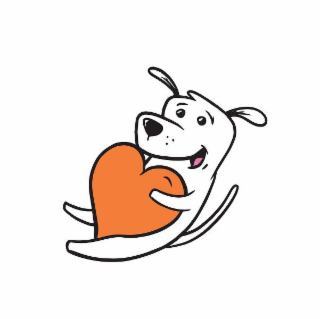 The mark consists of a graphic of a dog holding a heart. The dog and heart are outlined in black. The color black also appears in the dog's eyebrows, the shading in the dog's ears, the three dots near the dog's nose, the lines around the dog's mouth, and in the curved line on the heart. The dog's eyes and nose also are black except for the highlights thereon, which are white. The dog's mouth is pink. The interior of the heart is orange, except for the curved black line thereon. The dog's body is white. The remainder of the white in the drawing represents background areas only and is not part of the mark.