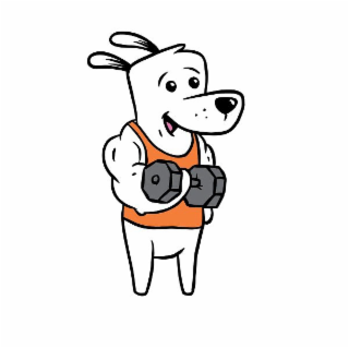 The mark consists of a graphic of a dog that is standing on its hind legs, wearing a shirt, and holding a barbell. The dog, shirt, and barbell are outlined in black. The color black also appears in the dog's eyebrows, the shading in the dog's ears, the three dots near the dog's nose, the small lines on the dog's front legs, and the lines around the dog's mouth. The dog's eyes and nose also are black except for the highlights thereon, which are white. The dog's mouth is pink. The interior of the barbell is gray. The interior of the dog's shirt is orange. The dog's body is white except for the small black lines on the dog's front legs. The remainder of the white in the drawing represents background areas only and is not part of the mark.