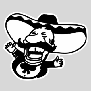 The mark consists of head of a cartoon man with a large nose and handle bar mustache wearing a sombrero, with an open mouth showing top and bottom teeth, with no neck, on a circular body with two arms with hands, wearing a bow neck tie.