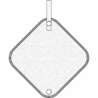 The mark consists of a three-dimensional product design of a personal hygiene towel in a squared circle shape, primarily a square-like shape with slightly curved sides and rounded corners, with buttons on two opposing corners, and a strap connected to one of the buttons. Stitching surrounds the outer edge of the squared circle, and the material contains perforations. The "stippling" in the image is not intended to show color, but is intended to depict the perforations.