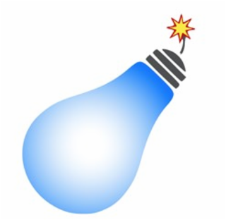 The mark consists of a blue and white light bulb that has a grey base. A grey fuse sprouts from the base and has a red and yellow spark at the end.