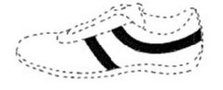 The mark consists of two stripes arranged on the side of a shoe; the first stripe runs underneath the upper edge of the shoe, approximately parallel to this edge from the upper surface of the shoe to the heel, the second stripe runs from the upper surface of the shoe to the lower surface of the shoe, the second stripe beginning a short distance away from the first stripe at the upper surface of the shoe and ending in approximately the middle of the shoe at its lower surface; the first stripe is curved, the second stripe is roughly straight; the first stripe is substantially longer than the second stripe; both stripes are essentially of equal width. The broken or dotted lines are not part of the mark and serve only to show the position or placement of the mark..