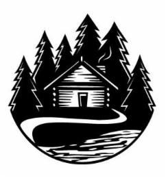 The mark consists of a body of water flowing in front of a curved pathway leading to a cabin in front of six evergreen trees of varying heights.