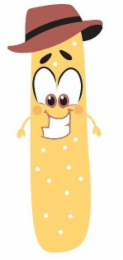 The mark consists of the color gold in the breadstick. The color black appears in the breadstick's eyebrows, the breadstick's hat, and the breadstick's eyes. The color brown appears in the breadstick's eyes, the breadstick's hat, and the breadstick's mouth. The color white appears on the breadstick's teeth and eyes and in small squares scattered across the breadstick. The color orange appears on the breadstick's cheeks.