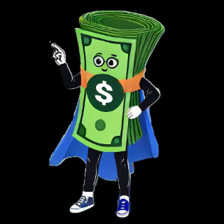 The mark consists of humanized green money with black and white limbs and black and white eyes, black eyebrows, and a black mouth, wearing blue and white shoes and a blue cape. The money is wrapped in an orange band with a green and white circle with a white dollar sign. All on a black background.