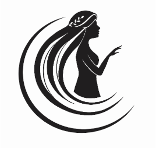 The mark consists of a stylized side profile of a woman with long flowing hair, wearing a laurel wreath crown, and appearing within the curve of an incomplete circle flowing in the same direction as the woman's hair.