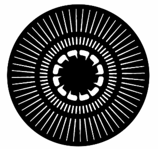 The mark consists of twelve (12) speech cloud shapes arranged radially in an inner circle with point directed inwardly, sixty (60) rounded radially arranged narrowing rounded dashes in a medium circle, and sixty (60) rounded pointed longer indicators radially in an outer circle, all on a round transparent background shape.