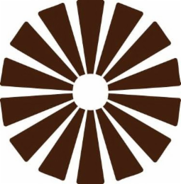 The mark consists of The logo consists of a central, smaller circle surrounded by 14 equally spaced, sharply pointed geometric triangular segments that radiate outward. The entire design is in a solid dark brown color with a transparent background..