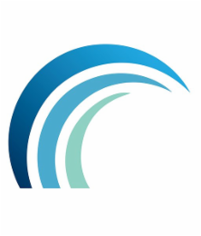 The mark consists of three tapered arcs of successively shorter length arranged to resemble a cresting wave. The first arc transitions from blue to light blue, the second arc is light blue, and the third arc is greenish blue.