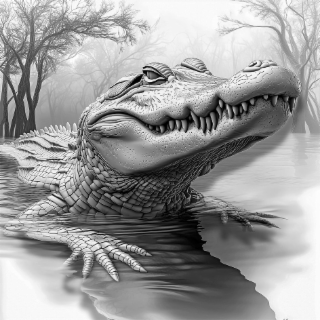The mark consists of a three-dimensional bas-relief depiction of an alligator rendered in grayscale with volumetric lighting and ambient occlusion shading, creating a raised or extruded look. This image is representative of applicant's recurring design style, characterized by deep-relief outlines, realistic shading, and sculptural details. No color is claimed as a feature of the mark. Any elements shown in dotted lines are not claimed as part of the mark and appear only to indicate placement or context.