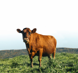 The mark consists of a brown cow standing in a green grass field rising to a small green and brown hill which is in front of an elevated green and brown hill across the blue and white horizon.