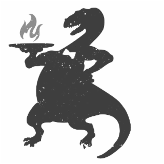 The mark consists of the image of a dinosaur with a cut-out of a bowtie, holding a platter with its right hand on which there is a flame.