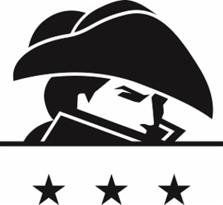 The mark consists of the bust of a man in a colonial hat shown in side profile facing to the right, above a horizontal line, all appearing above three five-pointed stars arranged in a horizontal line.