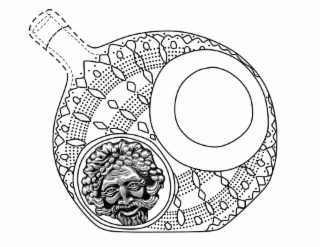 The mark consists of the three-dimensional configuration of the container of the goods, namely, a bottle shaped as a circular jug having a flat bottom and a circular opening with smooth tapered walls; the remaining surface of the jug comprises a geometric design of intersecting ovals, diamonds, waves and dots and a relief image of the Greek god Dionysus in a circular design. The matter shown in broken or dotted lines is not part of the mark and serves only to show the position or placement of the mark.