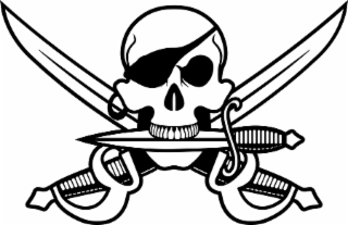 The mark consists of a skull and cross swords, the skull having an eye patch over its right eye, clenching a knife between its teeth.