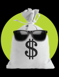 The mark consists of white cash bag in the center wearing black sunglasses, a black dollar sign on the front side of the bag and a white rope tying the bag together on the top with a green circle background. The remaining color black represents background, outlining, shading, and/or transparent area and is/are not part of the mark.