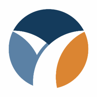 The mark consists of a circle that is split into three pieces by two white curved bands. One band starts at the base of the circle and curves up towards the upper right side of the circle, growing thinner as it extends upwards. The second band starts at the upper left part of the circle and grows thicker while curving towards the center of the circle, stopping just before connecting with the first band. The top portion of the circle is blue, the bottom left portion is blue, and the bottom right portion is orange. The additional white represents background and is not claimed as a feature of the mark.