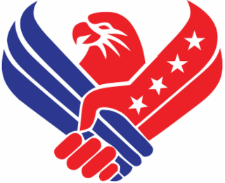 The mark consists of a red arm with four white stars shaking hands with a blue arm with white stripes with a red eagle head behind the arms.