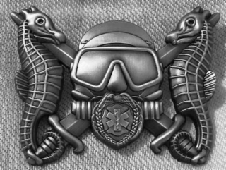 The mark consists of A scuba diver wearing a latex hood, and single window scuba mask. The center of his regulator has the outline of a police badge with an eagle on top of the badge and leaf scalloping down the edge of the badge. Inside the badge is a Maltese Cross and Star of life. There is a seahorse on either side of the diver, facing the diver. Each sea horse tail is wrapped around the handle of a dagger below the hilt of the dagger. The daggers have a handle with a guard protecting the hand, and at the bottom of the handle near the pommel is a copy of the guard in smaller size. The daggers cross behind the divers' head and the sea horse's heads. The sea horses are exact copies of each other and are symmetrical. The daggers are also symmetrical copies.