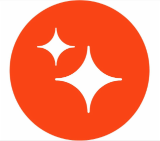 The mark consists of a smaller four pointed star, in white, above and to the left of a larger four pointed star, also in white, both inside of a shaded orange circle.