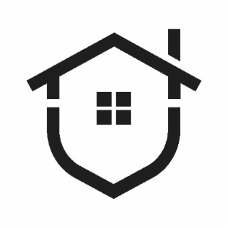 The mark consists of a stylized design of a house, including stylized depictions of a chimney, pointed roof, a window having four window panes, with the lower half of said house design depicted as a stylized curve ending in at a centered point.