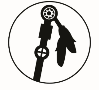 The mark consists of a leaning pole with the design of an eight-pointed star inside a circle at the top of the pole, and with two feathers attached. The design of a cross inside a circle appears in the middle of the pole.
