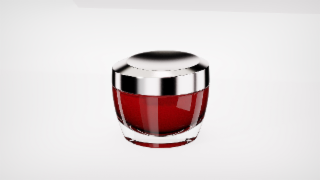 The mark consists of a circular red jar with tapered sides that has a translucent section at the base and a silver cap with a oval depression in the middle.