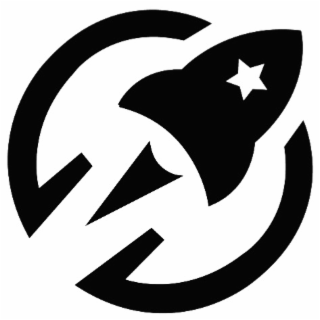 The mark consists of a rocket ship having a star-shaped window moving on an upward trajectory from left to right passing through a broken circle.