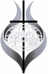 The mark consists of a design featuring a scepter, to the left of a five-pointed star, to the left of an open-top crown all centered across a flat globe with meridians and parallel lines. The globe is superimposed below the center of a Latin cross. From the bottom of the cross, a ribbon streams up the left and right sides of the cross.