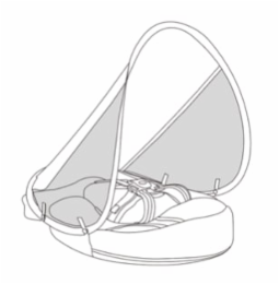 The mark consists of A THREE-DIMENSIONAL CONFIGURATION OF A PORTABLE BABY SEAT OR INFANT CARRIER. THE DESIGN INCLUDES A CONTOURED BASE WITH AN INTEGRATED CUSHIONED SEAT AND A HARNESS SYSTEM FEATURING STRAPS AND A CENTRAL BUCKLE. EXTENDING UPWARD FROM THE BASE IS A SEMI-CIRCULAR CANOPY OR SHADE STRUCTURE, WHICH IS PARTIALLY TRANSPARENT AND ATTACHED TO THE BASE AT SEVERAL POINTS ALONG THE PERIMETER. THE OVERALL SHAPE OF THE BASE IS ROUNDED, WITH SOFT, CURVED EDGES.
