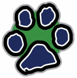 The mark consists of a print of a dog’s paw colored blue against a green background.
