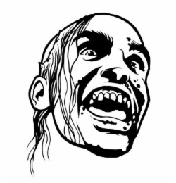 The mark consists of a human head with a maniacal face, stringy hair, and lines indicating a metal plate on the back right portion of the head.