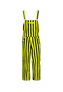 The mark consists of a repeating pattern of vertical black and yellow parallel wide stripes over the entire outer surface of the goods. The broken lines depicting the outer perimeter and shape of the overalls, their fastenings, and the rectangular area for a label indicate placement of applicant’s brand mark on the goods and are not part of the instant mark.