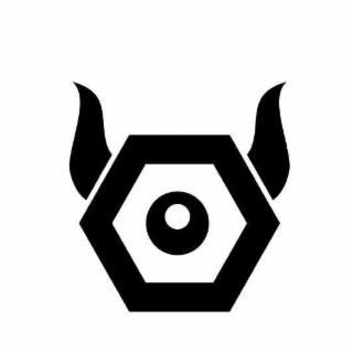 The mark consists of a hexagon containing a stylized eye design comprising a circle within a shaded circle. There are two horns, one emanating from the upper left side of the hexagon and one from the upper right side.