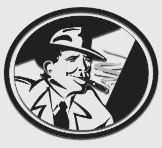 The mark consists of a man, at chest level and upward, with black hair with a fedora on top of his head with a rounded top, wearing a trench coat over a dress shirt and black tie, smoking a cigar with swirly smoke above the lit end of the cigar with a spotlight shining on the man.