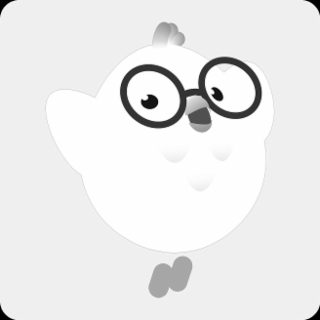 The mark consists of a stylized cartoon depiction of a chicken with large round eyes wearing thick-rimmed circular glasses. The chicken has small wings, a beak, and a comb on top of its head, and appears to be floating with two oval shapes below it suggesting feet or motion.