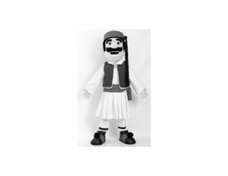The mark consists of An adult male greek ceremonial soldier, an Evzone, with a mustache and cartoonish face wearing the following: a fez-style hat with a long tassel; a knee length, pleated skirt closed with a cotton belt; leggings fastened with a garter; shoes with a decorative pompon attached; a white shirt; and a vest.