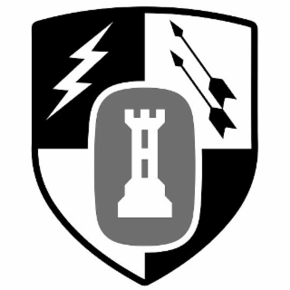 The mark consists of the image of a shield split into four parts, the top left portion features a stylized lightning strike and the top right portion features two stylized arrows. In the center of the shield is a stylized oval design featuring a stylized castle tower design centered within the oval.
