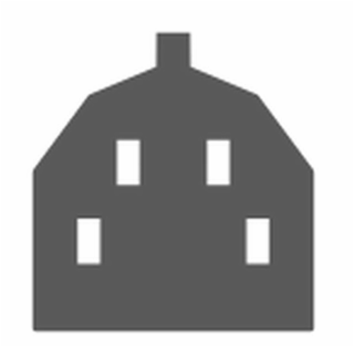 The mark consists of A silhouetted building with a chimney centered atop a gambrel roof with two windows over two more widely spaced windows on the lower part of the building.