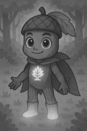 The mark consists of a character made of bark with glowing boots, a glowing leaf on its torso, a cape made of leaves, and an acorn hat with a leaf. The character is standing in a forest full of bushes and trees.