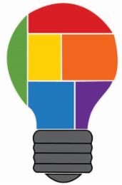The mark consists of the stylized light bulb featuring a base and top components. The base portion of the light bulb consists of a gray-colored spiral design. The top portion of the light bulb features six asymmetrical colored blocks separated by white space. The top center segment is colored red. The left segment is colored green. The center segment is colored yellow. The right segment is colored orange. The bottom left segment is colored blue. The bottom right segment is colored purple.