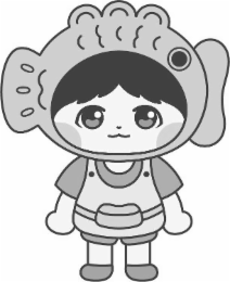 The mark consists of a stylized cartoon character of a child wearing a fish costume. The costume includes a large fish headpiece with a fin on each side, a circular eye on the upper right, and scale-like detailing on top. The child's face is visible through an oval opening in the fish head, with large eyes, a small smile, and circular blush marks on both cheeks. The child is wearing a short-sleeve shirt, overalls with a rounded front pocket, and shoes. The character is depicted in a forward-facing, standing position with arms slightly outward.