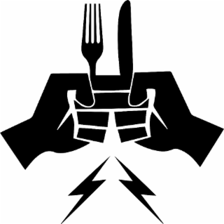 The mark consists of A left hand clenched in a fist holding a fork, and a right hand clenched in a fist holding a knife, positioned above a pair of stylized lightning bolts.