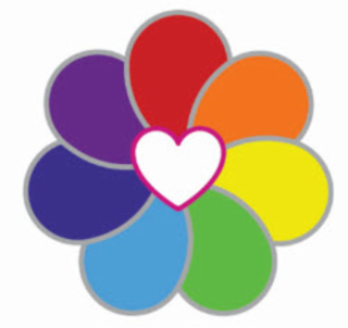 The mark consists of a stylized, circular flower with seven petals, each petal in a distinct color, arranged clockwise starting from the top as follows: red, orange, yellow, green, blue, indigo, and violet. Each petal is outlined in the color of light gray. At the center of the flower, is a heart shape, outlined in the color of magenta with a white center. The flower has no stem.