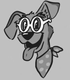 The mark consists of a dog head in three-quarter profile, with floppy ears, round glasses, triangular nose, hanging tongue, and bandana; the grayscale indicates shading and background only with no color being claimed.