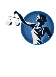 The mark consists of an image of the head, arm, and torso of a blindfolded goddess holding a set of scales, all appearing in the colors white, black, and light blue. Behind the goddess is a circle containing a swirl design, all appearing in the colors blue, grey, and dark blue.