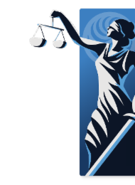 The mark consists of of an image of a blindfolded goddess holding a sword and a set of scales, all appearing in the colors white, black, and light blue. The goddess is set against a rectangular background, with a swirl design positioned at the top of the rectangle, all appearing in the colors blue, grey, and dark blue.
